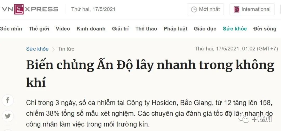 阮青龙称,英国变异病毒的传播速度为常规新冠病毒的1.7倍,而印度变异病毒的传播速度比英国变异病毒还要快。从本轮疫情的实际情况看,印度变异病毒通过空气接触,尤其是在封闭环境中的传播速度十分快速。越南北江省光洲工业园区Hosiden公司的感染就是一个十分突出的例子。