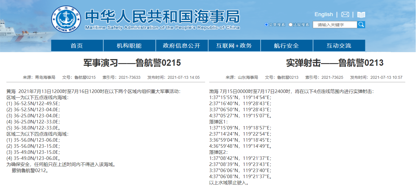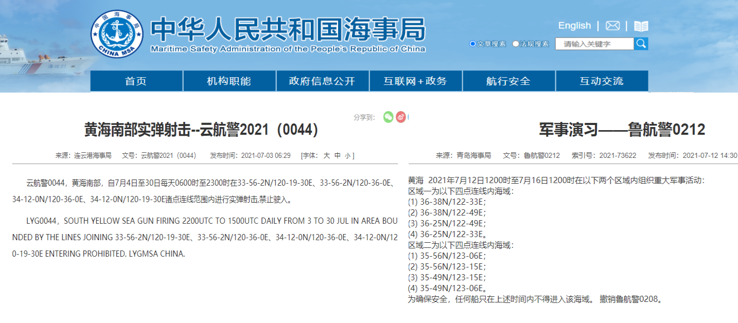 黄海,渤,海禁,航,军事,演练,7月,12日,至,30日,期